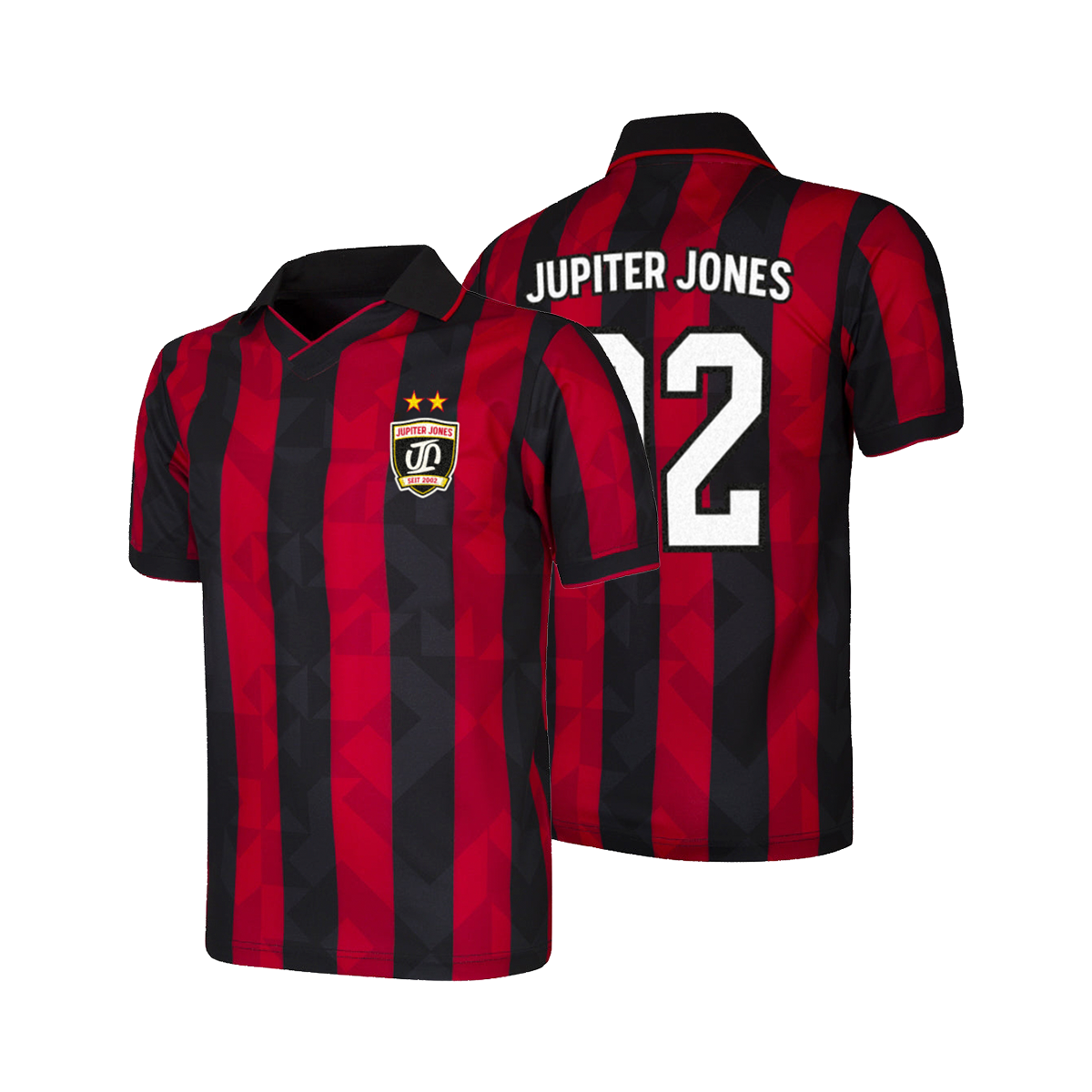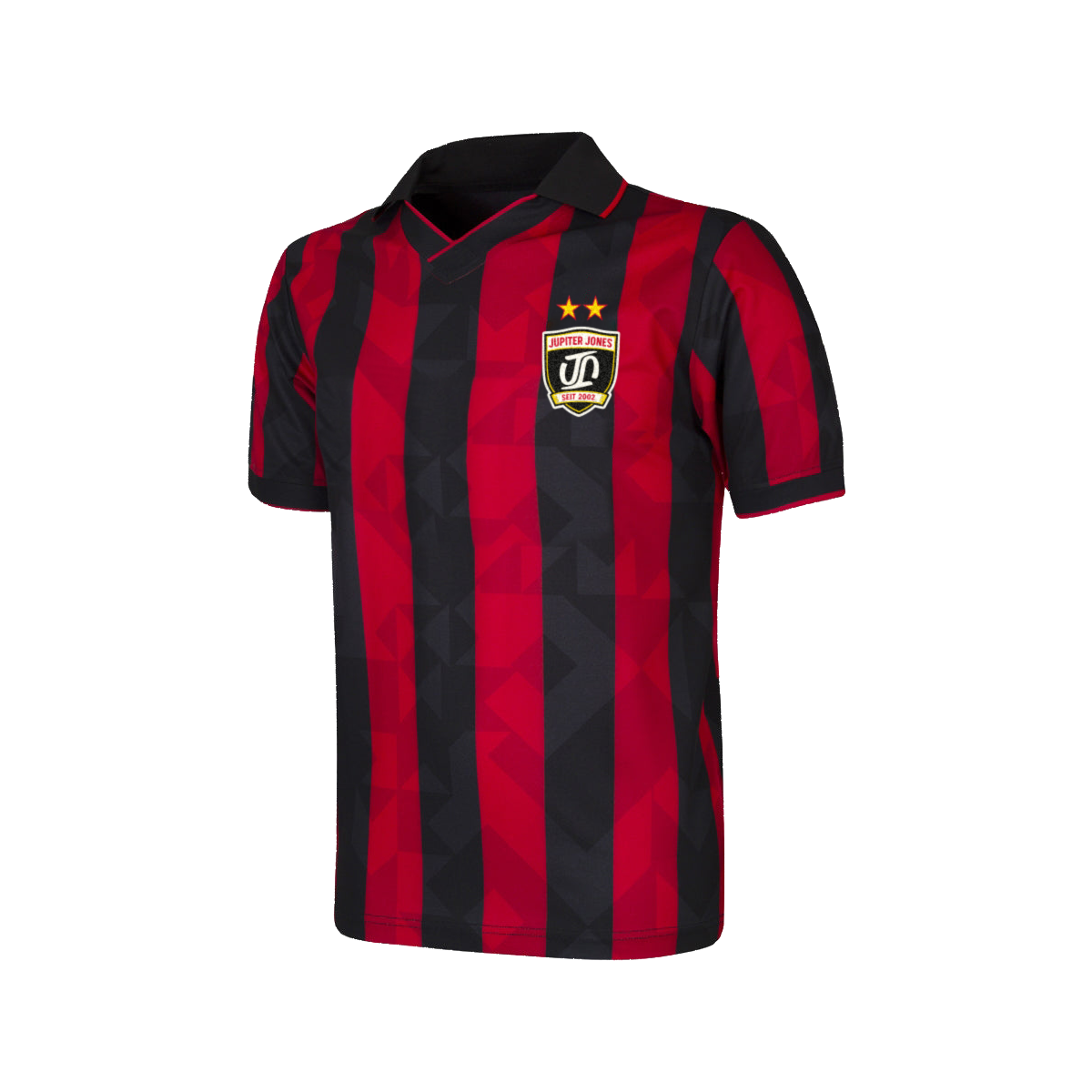 Dieses hochwertige Jupiter Jones Fußball-Trikot überzeugt mit einem klassischen Design aus roten und schwarzen Streifen. Es ist custom made gefertigt und verfügt über einen aufgenähten Stoffpatch auf der Brust, gestickte Sterne als edles Detail sowie ein digitalgedrucktes Rückenmotiv.
